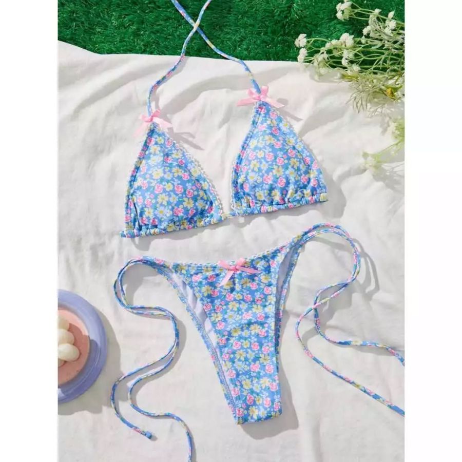 ????Swift Bra????ชุดว่ายน้ำbikini บิกินี่ 2 ชิ้น ลวดลายพิมพ์ โบว์สีชมพู เชือกผูก ใหม่ พร้อมฟองน้ำ